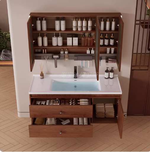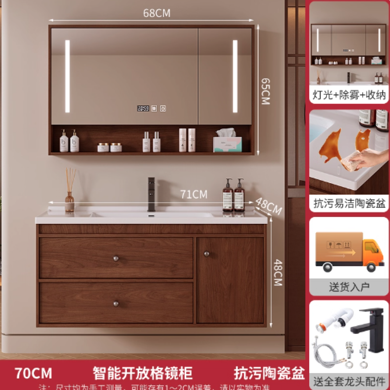 首页> 灯具照明> 沐枫优家胡桃色中古风实木浴室柜陶瓷一体盆卫生间洗手盆洗70CM胡桃色